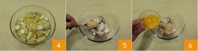 y sumérjalas en agua fría acidulada, donde habrá exprimido un limón, para evitar que se oscurezca 4. Mientras tanto, ocuparse de las albóndigas. En un recipiente mezcle la carne picada, la sal y la pimienta, el queso parmesano rallado y el pan rallado 5. Luego agregue los huevos ligeramente batidos 6