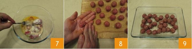 y mezcle bien todo 7, hasta obtener una masa suave pero compacta. Forme las albóndigas de aproximadamente 10 gramos cada una 8 (de este modo debería obtener alrededor de 30) y guárdelas en el frigorífico cubiertas con film hasta que el caldo esté listo 9.