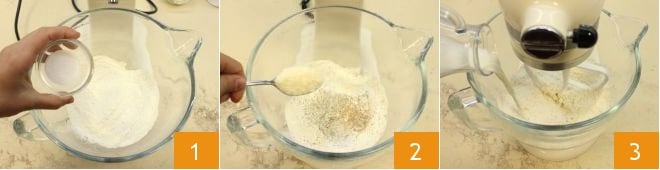 Para realizar la charlotte salada empezad con la preparación del pan brioche: tamizad las harinas en el bol de una amasadora con el accesorio de pala. Agregad el azúcar 1, la nuez moscada rallada, el queso parmesano rallado 2 y la levadura deshidratada. Poned en marcha la pala a velocidad media e incorporad también los líquidos: la leche 3 y el agua a temperatura ambiente.