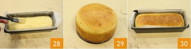 y el plumcake 28 y horneadlos en horno estático precalentado a 180° durante 30 minutos (el plumcake) y durante 40 minutos (el pastel) si el horno es ventilado a 160° durante 20-30 minutos). Podéis hornearlos juntos y sacar primero el plumcake. Una vez cocidos, sacad las masas del horno y dejad que se enfríen (29-30).