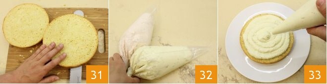 Cortad la parte superior de la base redonda para obtener una superficie regular, luego dividid el pan brioche redondo en 3 capas 31 como si fuera un bizcocho (para más detalles, consulta la Cómo cortar el bizcocho) Tomad las cremas, colocadlas en dos mangas pasteleras desechables sin boquilla 32 y rellenad el pan brioche realizando círculos concéntricos empezando desde el exterior 33