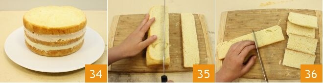 alternando los sabores entre una capa y otra 34; con la crema restante cubrid también toda la superficie y el borde. Pon la charlotte en el frigorífico; mientras tanto, desmolda la otra masa en forma de plumcake, corta la superficie para igualar la forma, retira la corteza y corta rebanadas de 1 cm de grosor a lo largo 35. De estas, cortad rectángulos de aproximadamente 1,5x2 cm 36.