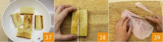 Debéis obtener unas 20 rebanadas para tostar en una sartén con un poco de aceite por ambos lados 37, luego dividid las rebanadas por la mitad y reservadlas 38. Ahora decorad la charlotte: de las lonchas de jamón sacad pequeños triángulos 39,