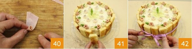 enrolladlos para crear pequeñas rosas 40. Tomad la charlotte del frigorífico y decoradla con las rebanadas tostadas de pan brioche dispuestas alrededor de todo el perímetro una junto a otra 41 y distribuid sobre la superficie las pequeñas rosas alternándolas con copos de crema, hojas de albahaca. En el centro, colocad las tiras de puerro reservadas y para terminar, espolvoread con semillas de amapola. Último toque refinado: envolved con una cinta de raso la charlotte 42. Tu charlotte salada está lista para ser servida.