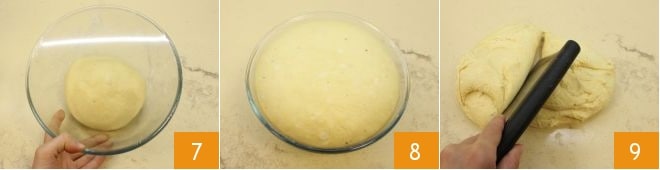 Transferid la masa sobre la superficie de trabajo y formad una bola. Ponedla en un bol grande, cubrid con film 7 y dejadla leudar durante 30 minutos en el horno apagado con la luz encendida. Tomad nuevamente la masa que habrá duplicado su volumen 8, divídidla en dos partes 9 una con un peso de 650 g