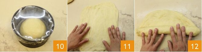 que modelaréis dando forma de esfera, luego colocadla en un molde engrasado y forrado con papel de horno de 18 cm de diámetro y 10 cm de altura, como el del panettone, cubrid con film 10 y dejadla leudar durante 2 horas en el horno apagado con la luz encendida. Estirad la parte restante de la masa en una hoja rectangular 11, enrolladla desde el lado más corto para crear un cilindro con la parte del cierre hacia abajo 12.