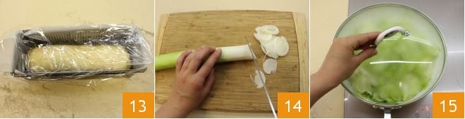Engrasad y forrad con papel de horno un molde de plumcake de 26X10 cm e insertad dentro el cilindro de masa, cubrid con el film 13 transparente y dejadlo leudar durante dos horas en el horno apagado con la luz encendida. Mientras tanto, empezad a preparar las cremas para el relleno: eliminad la parte más externa de los puerros, lavadlos, cortadlos finamente 14, reservad algunos filamentos de la parte más tierna para adornar la charlotte. Cocinadlos a fuego lento con un poco de aceite en una sartén con tapa 15