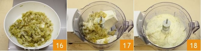 hasta que estén tiernos 16: se necesitarán unos 30 minutos. Dejad que se enfríen y luego colocadlos en la batidora con la ricotta 17, 1 cucharada de queso parmesano, una pizca de sal y pimienta. Batid los ingredientes hasta obtener una crema homogénea 18, pasadla por un colador para hacerla más suave y pasadla a un bol.