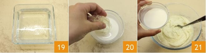 Mientras tanto, poned a remojo en dos recipientes diferentes con agua fría 3 g de gelatina (para la crema de puerros) y en el otro 1 g de gelatina (para la crema de jamón), durante al menos 10 minutos 19. Pasado el tiempo necesario, escurrid los 3 g de gelatina en hojas, exprimidlas bien y disolvedlas en 50 ml de nata caliente 20, mezclando hasta la completa disolución de la gelatina. Luego, unid la mezcla a la crema de ricotta 21
