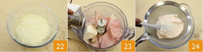 mezclad con una cuchara y luego pasad la crema por un colador para hacerla más suave, cubrid con film en contacto 22: poned la crema en el frigorífico para que se endurezca y dedicad tiempo a la crema de jamón: en la batidora colocad la ricotta, las lonchas de jamón cocido, sal, un poco de aceite de oliva, nuez moscada y pimienta 23. Batid todo para obtener una crema homogénea, luego pasadla por un colador y recógela en un bol 24.