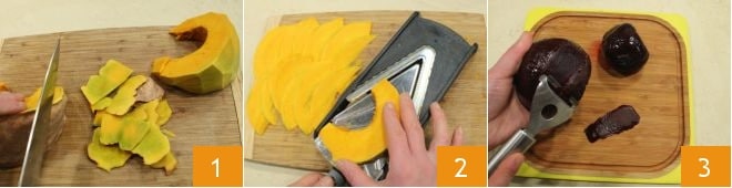 Para realizar las chips de verduras empieza cortando la calabaza en gajos, luego elimina la piel con un cuchillo 1 y corta en rodajas finas con una mandolina 2. Pela la remolacha 3