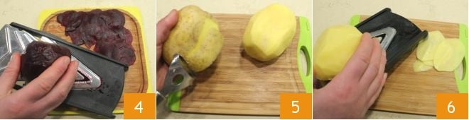 corta también esta con la mandolina para obtener rodajas finas 4. Por último, pela las patatas 5 y procede como has hecho con las otras verduras: corta con la mandolina obteniendo rodajas bastante finas 6.