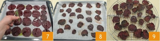 Forra una bandeja con papel de horno, coloca las rodajas de remolacha, rocíalas con un poco de aceite de oliva, sala y sazona con algunas ramitas de romero 7. Hornea las chips de remolacha en un horno con ventilación a 220° durante 20 minutos o el tiempo necesario para que se sequen (o en horno estático a 230° durante 40 minutos). Al terminar la cocción, saca las chips 8 y colócalas sobre una rejilla para que se enfríen 9.