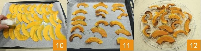 Ahora continúa con la calabaza: distribuye las rodajas de calabaza sobre una bandeja forrada con papel de horno, condiméntalas con aceite de oliva, sal y romero 10, hornea las chips de calabaza en un horno con ventilación a 220° durante 10 minutos (o en horno estático a 230° durante 40 minutos). Cuando estén bien crujientes, sácalas 11, colócalas sobre una rejilla y déjalas allí hasta que estén frías 12.