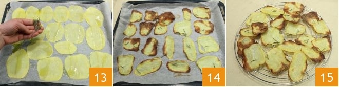 Para finalizar, procede de la misma manera con las patatas: coloca las rodajas de patata sobre la bandeja forrada con papel de horno 13, hornea las chips de patata con la misma modalidad en horno con ventilación a 220° durante 10 minutos (o en horno estático a 230° durante 15 minutos), al finalizar la cocción las patatas estarán doradas y crujientes, sácalas 14 y déjalas enfriar sobre la rejilla 15.