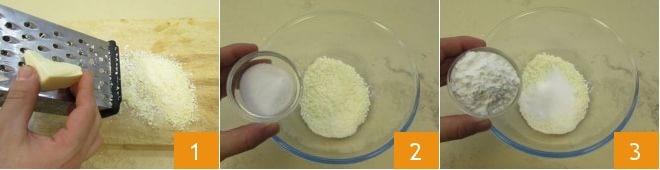 Para preparar el chocolate caliente blanco en la cocina deberéis realizar el mismo preparado en polvo usado para la versión al microondas: rallad la tableta de chocolate blanco con un rallador de malla fina para que quede lo más fino posible 1. Verted el chocolate rallado en un bol, añadid el azúcar 2 y el almidón de maíz 3.