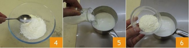 Mezclad los polvos 4 y habréis obtenido así el preparado para realizar 4 porciones de chocolate. En un cazo verted la leche 5, calentarla a fuego bajo 6 y añadid todo el preparado de chocolate y polvos poco a poco 6