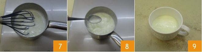 removiendo con la varilla 7 para obtener un compuesto homogéneo y sin grumos. Continuad la cocción a fuego bajo, removiendo continuamente el compuesto hasta que el chocolate se haya espesado bien, tardará unos 5 minutos. Cuando el chocolate esté listo 8 apagad el fuego y vertedlo en las tazas. Servid inmediatamente el chocolate caliente blanco 9.