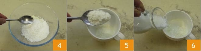 Mezclad los polvos 4 y habréis obtenido así el preparado para realizar 4 tazas de chocolate. Ahora proceded preparando una taza a la vez: en una taza añadid aproximadamente 33 g del preparado en polvo 5, aparte calentad ligeramente 200 g de leche para que no esté fría de nevera y vertedla en hilo dentro de la taza 6,