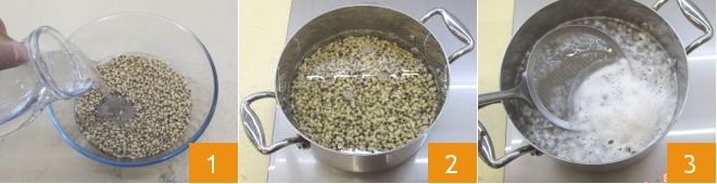 Para preparar las chuletas vegetarianas, comenzad la noche anterior, poniendo a remojo las alubias secas en agua fría 1. Transcurridas al menos 12 horas, enjuagad las alubias y trasladadlas a una olla con abundante agua fría sin sal 2 y cocedlas a fuego lento durante unas 2 horas, eliminando cuando sea necesario la espuma que se forma en la superficie 3.