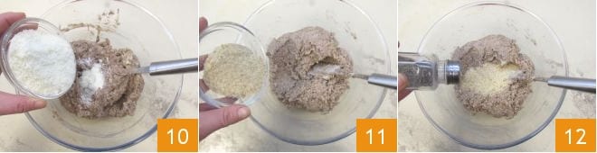 Añadid también el queso rallado 10, el pan rallado 11 y ajustad la pimienta 12 y la sal.