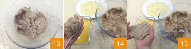 Mezclad con cuidado 13, debe resultar una masa compacta no pegajosa. Luego ocupáos del empanado: preparad un bol bajo y ancho con los huevos batidos y un plato con el pan rallado. Tomad con la ayuda de una cuchara una cantidad de mezcla de alubias correspondiente a unos 150 g 14 y aplastadla en la palma de la mano hasta darle la forma plana y ligeramente irregular de una chuleta 15.