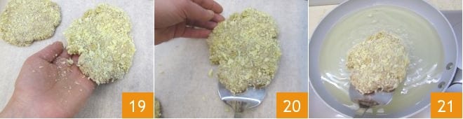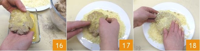 Durante las próximas operaciones debéis prestar atención y ser muy delicados, porque la chuleta vegetariana a diferencia de la de carne corre el riesgo de romperse durante el empanado y la posterior cocción. Sumergid en el huevo, por ambos lados, la chuleta 16, luego pasadla por el pan rallado 17. Repetid la operación, sumergiendo una segunda vez la chuleta ya empanada en el huevo, y luego de nuevo en el pan rallado 18: este doble empanado hará la chuleta más sabrosa y ayudará a mantener mejor la forma.