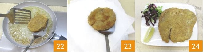 Cuando esté bien dorada, dadle la vuelta por el otro lado ayudándoos con 2 espátulas 22. Dorad también este lado, luego escurrid la chuleta y ponedla a secar sobre una hoja de papel absorbente, para que pierda el exceso de aceite 23. Continuad con las otras chuletas vegetarianas, y servidlas bien calientes acompañadas de un gajo de limón como manda la tradición!