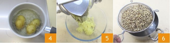 Mientras tanto, poned a hervir una olla de agua fría con las patatas enteras bien lavadas y cocedlas durante unos 25-30 minutos desde que hierva 4. Al final, al pincharlas con un tenedor, deben resultar blandas. Escurridlas y dejadlas templar lo suficiente para poder manejarlas, luego machacadlas con un prensapatatas y recoged el puré obtenido en un bol 5 (alternativamente podéis pelarlas y pasarlas por el pasapurés o machacarlas con un tenedor). Volved a ocuparos de las alubias: cuando estén casi cocidas, salarlas. Terminad la cocción, escurridlas y dejadlas reposar dentro de un colador para que pierdan cualquier rastro de agua en exceso 6.