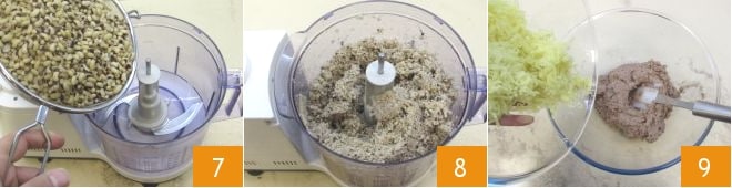 Una vez secas, trasladad las alubias al vaso de la batidora 7 y accionad las cuchillas para reducirlas a un compuesto pastoso y fino 8. Trasladad este paté a un bol grande y añadid las patatas machacadas 9.