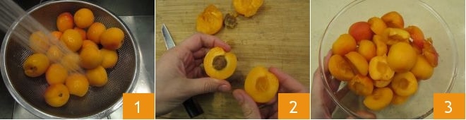 Para hacer el chutney de albaricoques, lave bien los albaricoques 1, luego séquelos, córtelos por la mitad 2 y elimine el hueso. Recoja los albaricoques deshuesados en un bol y resérvelos.