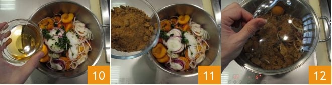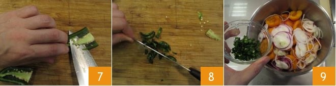 extraer las semillas internas con un cuchillo 7 y picarlo 8. En una cacerola grande, verter los albaricoques, el cebollino, el chile 9,