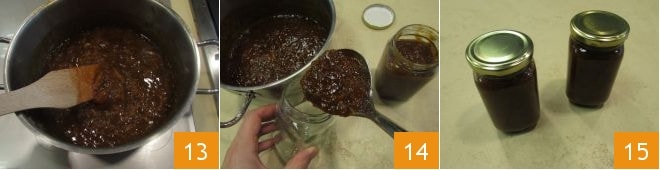 El chutney está listo 13: si desea consumirlo de inmediato, puede dejarlo enfriar y verterlo en frascos (14-15), si, en cambio, desea conservarlo por más tiempo, transfiéralo aún caliente a frascos previamente esterilizados, llene los recipientes hasta 1-2 centímetros del borde, cierre con las tapas, voltee los frascos y deje enfriar.