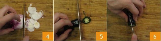 Limpiar el cebollino y cortarlo en rodajas 4. Eliminar el tallo del chile 5, cortarlo por la mitad a lo largo 6,
