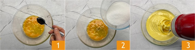 Para preparar el roscón con huevos de Pascua, lo primero es cascar los huevos en un bol y batirlos rápidamente. Añade el extracto de vainilla 1, el azúcar 2 y bate con batidoras eléctricas durante unos 5 minutos, hasta obtener una mezcla aireada 3.