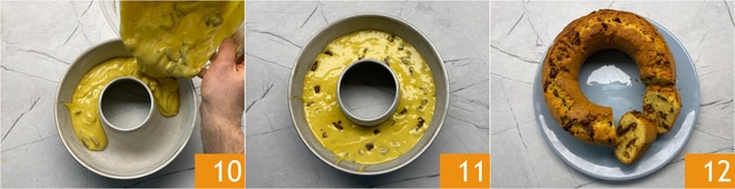 Unta con mantequilla y enharina un molde de anillo de 24 cm de diámetro en la superficie y 20 cm en la base, vierte en su interior la mezcla 10 y nivela la superficie 11. Cuece en horno estático a 180° durante unos 45 minutos. Antes de sacarlo del horno, verifica la cocción con un palillo, luego déjalo templar en el molde. Después de desmoldarlo, tu roscón con huevos de Pascua está listo para ser servido 12, ¡quizás con una espolvoreada de azúcar glas!