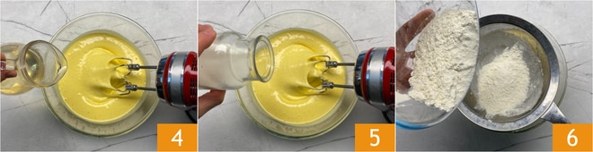 Continuando batiendo, vierte a hilo el aceite de semillas 4 y la leche 5. Ahora añade la harina tamizada 6.