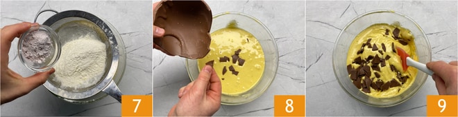 Añade también la levadura tamizada 7, una pizca de sal e incorpora los ingredientes secos con una espátula, mezclando suavemente de abajo hacia arriba. Por último, trocea groseramente el chocolate del huevo de Pascua 8 y mezcla de la misma manera para amalgamarlo de forma uniforme 9.