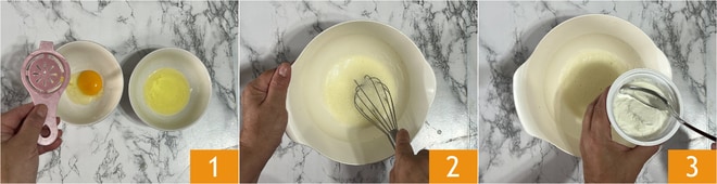Para preparar los cicciopancake, separad las yemas de las claras y verted estas últimas en un bol 1. Montad las claras con un batidor de mano 2, deben quedar espumosas. Agregad el yogur 3 y batid de nuevo con el batidor.
