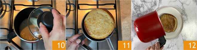 Cubrid con una tapa 10 y coced durante unos 10 minutos a fuego bajo, luego girad con cuidado con una espátula o tenedor y terminad la cocción del otro lado 11 durante otros 10 minutos. Voltead el cicciopancake en un plato de servir 12.
