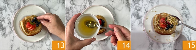 Decorad con los frutos del bosque 13, el sirope de agave y el granillo de pistachos 15. Servid enseguida 15.