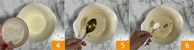 Incorporad también la harina de avena 4, el sirope de agave 5 y la levadura 6.
