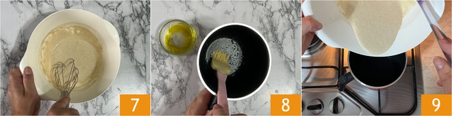 Mezclad el tiempo necesario hasta que la mezcla sea homogénea 7. Engrasad con aceite de semillas (o de coco) una sartén de unos 12 cm de diámetro, con bordes altos 8 y calentad al fuego. Verted la mezcla 9.