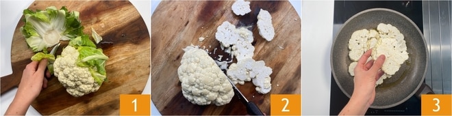 Para preparar la coliflor a la pizzaiola, lavad la coliflor, quitad las hojas que puedan quedar 1 y luego removed la raíz del tallo, dejando sin embargo la parte donde están unidas las flores, de manera que las rodajas que obtendréis (de aproximadamente 1 cm) quedarán más intactas 2. Si se desmorona, no os preocupéis, se recompondrá en la sartén. Recomendamos dejarla lo más entera posible solo para mejorar la consistencia al pincharla con el tenedor. Calentad un hilo de aceite en una sartén antiadherente de aproximadamente 30-32 cm de diámetro (aseguraos de tener la tapa porque la necesitaréis). Disponed las rodajas de coliflor hasta cubrir uniformemente el fondo 3, sazonad con una pizca de sal.