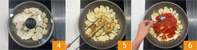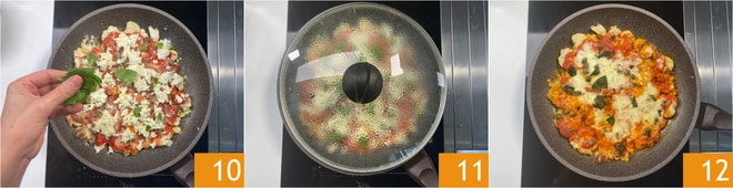 Sazonad con pimienta y hojas de albahaca 10. Cubrid 11 y cocinad durante unos 10 minutos a fuego un poco más moderado. En este punto, quitad la tapa y dejad secar, volviendo a subir un poco la temperatura, durante 5 minutos. Dejad reposar durante un par de minutos antes de servir vuestra coliflor a la pizzaiola 12.
