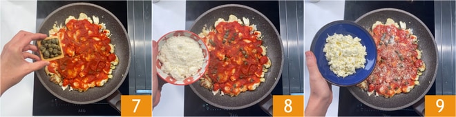 Sazonad con una pizca de sal, lo suficiente para sazonar la salsa, las alcaparras ya desaladas y groseramente desmenuzadas 7, el Pecorino rallado 8, la mozzarella previamente escurrida y desmenuzada 9.
