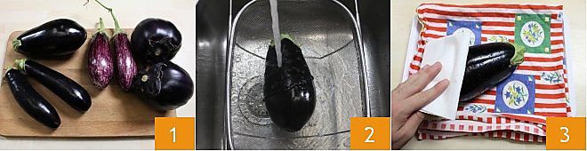 Primero asegúrate de que la consistencia de la berenjena sea firme, la piel sea brillante y lisa, sin abolladuras o manchas marrones y que el peso sea proporcional a su tamaño. De la calidad de la berenjena, de hecho, depende el éxito de tu plato. A pesar de que hay diferentes tipos: redondas, ovaladas, oblongas y largas 1, las berenjenas se limpian todas de la misma manera. Así que lava cuidadosamente la berenjena bajo agua corriente 2 y sécala con un paño 3.