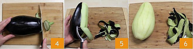 Luego, retira el pedúnculo, que a veces puede ser espinoso, con un cuchillo 4 y si prefieres elimina también la base, que sin embargo deberás mantener si, por ejemplo, quieres preparar berenjenas rellenas. En la mayoría de las recetas de la tradición culinaria italiana la piel no se quita. En caso de que quieras quitar la piel, consigue un pelador de patatas o un cuchillo e incide la piel sosteniendo la berenjena con la extremidad más estrecha hacia arriba y quita la piel de arriba hacia abajo 5, hasta que la berenjena esté completamente pelada 6.