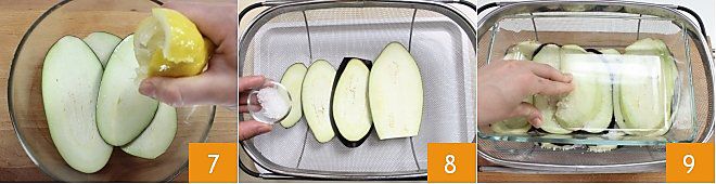 Es importante recordar que la berenjena debe pelarse en el momento de usarla, porque tiende a oscurecerse muy rápidamente. Para evitar este inconveniente puedes exprimir un poco de jugo de limón sobre la berenjena pelada y luego cortada en rodajas 7. Si deseas eliminar el sabor amargo, el exceso de agua y por lo tanto hacerla más dulce, desagua la berenjena bajo sal antes de proceder a la cocción. Después de haberla lavado, córtala en rodajas y coloca las rodajas en un colador, donde las espolvorearás con sal gruesa 8. Luego cúbrelas con un plato o una bandeja 9 y pon un peso encima para favorecer el desagüe.