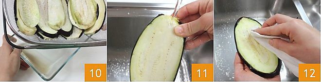 Déjalas desaguar durante unas 2 horas, para que salga parte del líquido amargo 10. Luego enjuaga las rodajas una a una 11 y sécalas con un paño 12. Por supuesto, la berenjena en este caso resultará más salada.